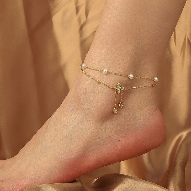 TORNOZELEIRA TREVO CRAVEJADO E PÉROLAS KIT BANHADO EM OURO 18K - TOR36
